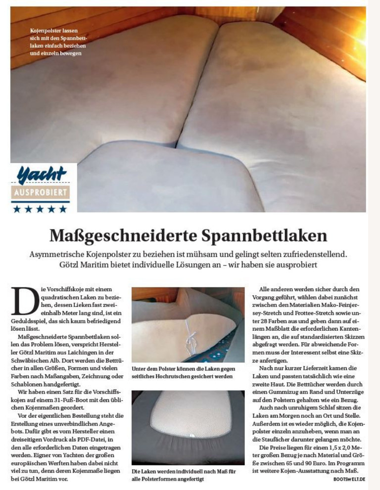 2023 wurde unser Yacht-Spannlaken von der Zeitschrift YACHT ausprobiert und für sehr gut befunden.